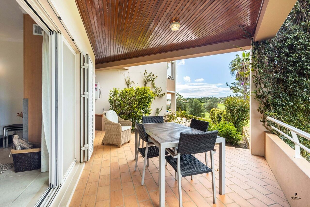 Confortável apartamento T2 no rés do chão, localizado no Empreendimento de Vale da Pinta com vista sobre o fairways 3 e 9 do campo de golfe.