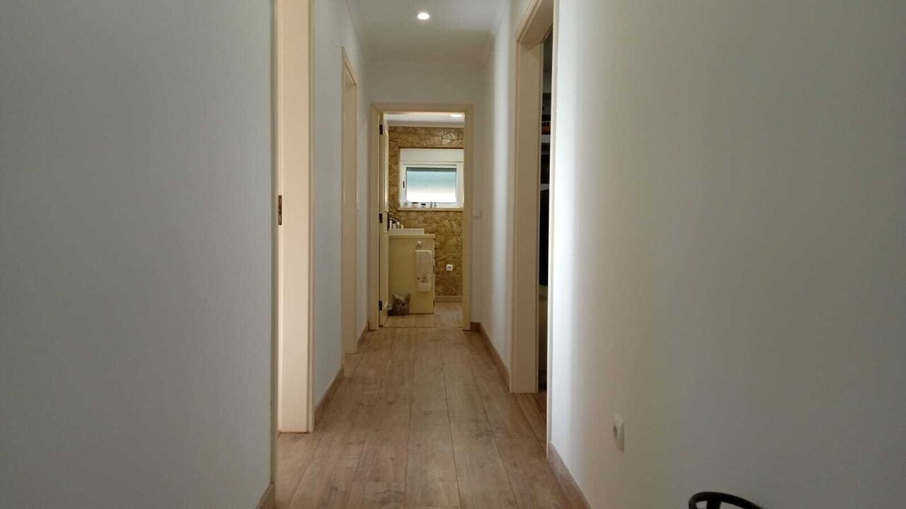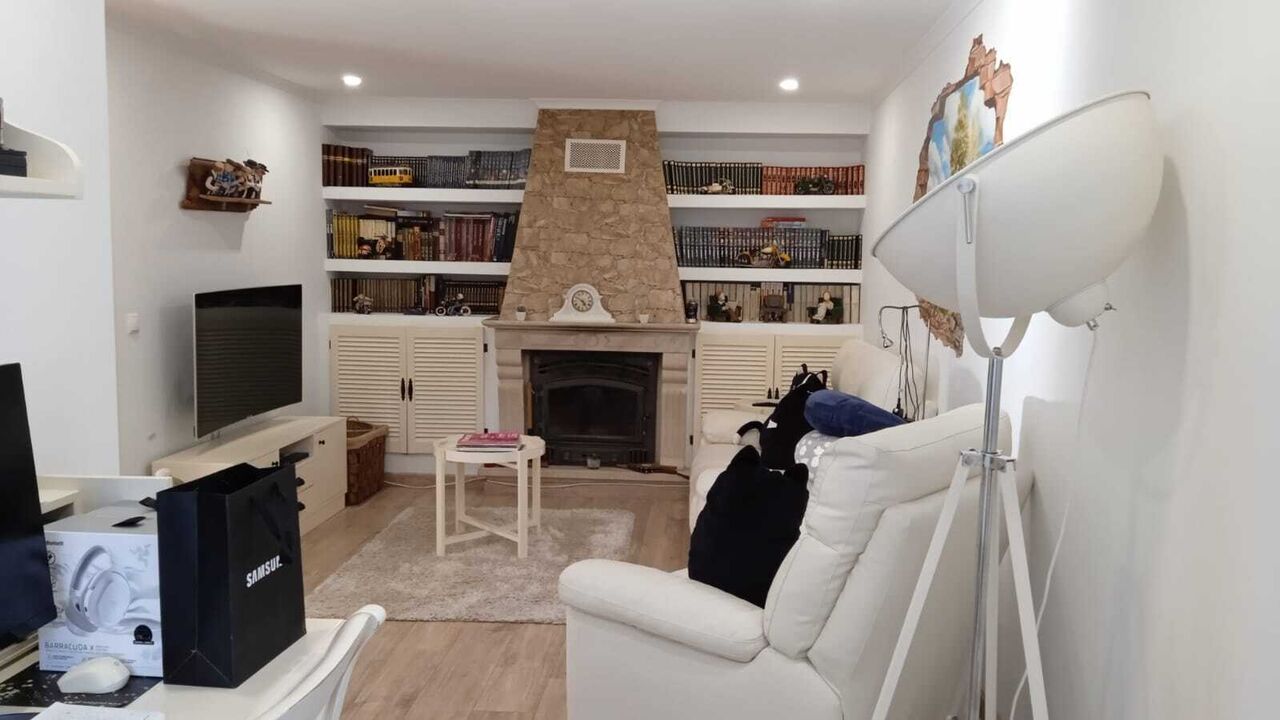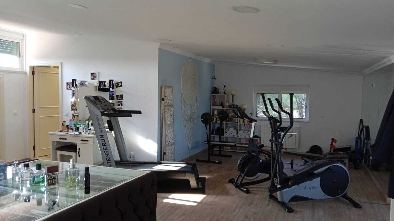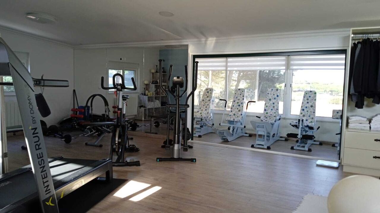 The exterior is dedicated to leisure, highlighting the infinity pool with heated water and jacuzzi, an outdoor kitchen, a sauna, and an independent library. The property features smart technology, including phone-controlled electric shutters and video surveillance. It includes a two-car garage, kennel, and traditional Portuguese pavement. The sale includes an adjacent rustic plot of 840sqm, enhancing privacy and total space.