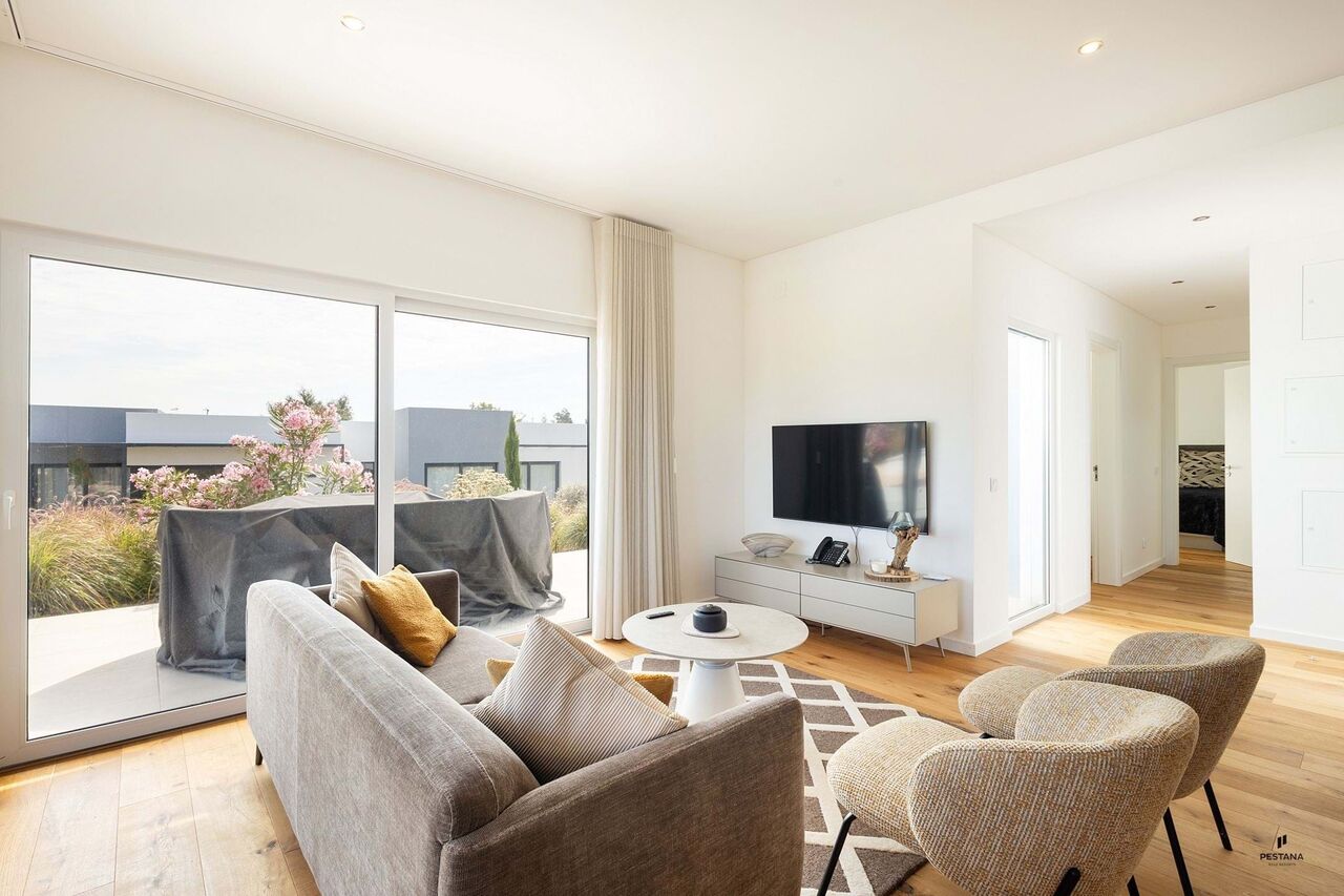 The elegantly equipped open-plan kitchen and living room have large windows providing light and views of the pool.