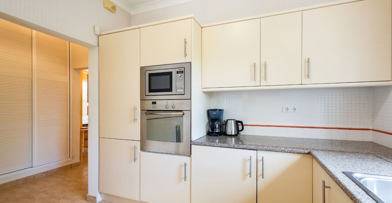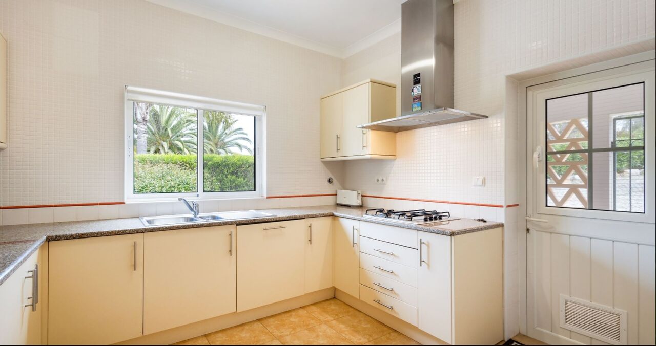 A cozinha totalmente equipada tem acesso ao exterior onde encontramos uma útil zona de arrumação e lavandaria.